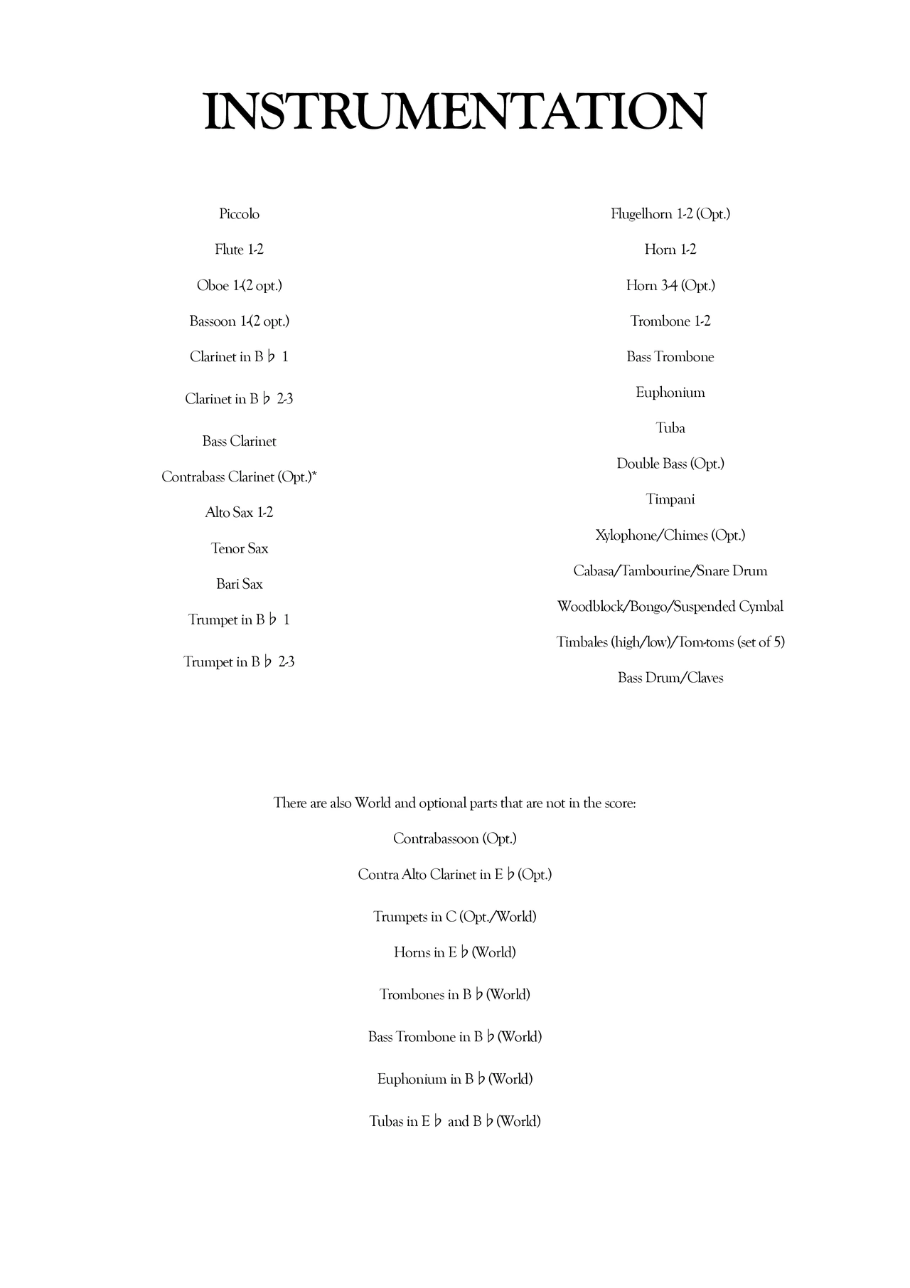 Instrumentation: Piccolo, Flute 1-2, Oboe 1-2, Bassoon 1-2, Clarinet 1-3, Bass Clarinet, Contrabass Clarinet (opt.), AATB saxes, Trumpet 1-3, Flugelhorn 1-2 (opt.), Horn 1-4, Trombone 1-2, Bass Trombone, Euphonium, Tuba, Double Bass (opt), Timpani, Xylophone/Chimes, Cabasa/Tambourine/SD, Woodblock/Bongos/Suspended Cymbal, Timables/Tom-toms (5), Bass Drum/Claves