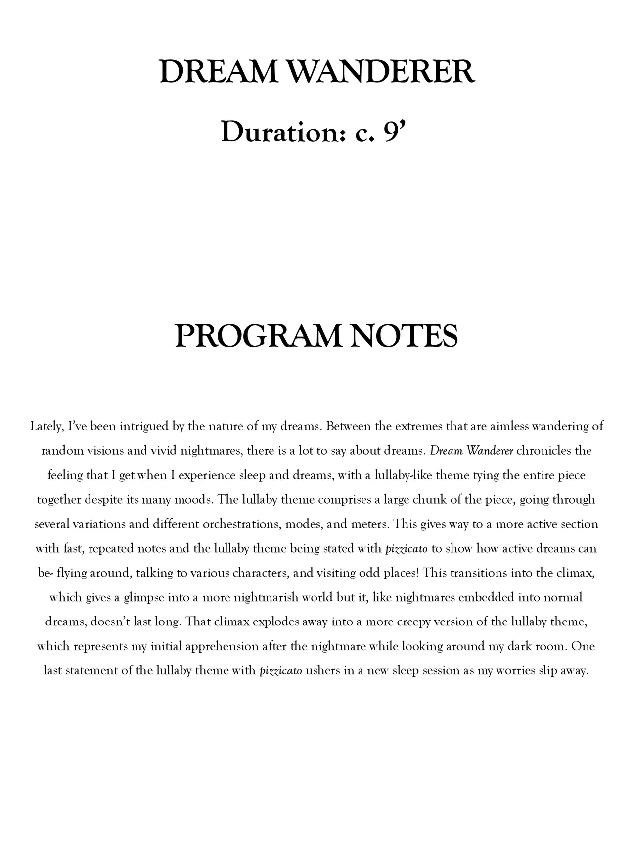 Lately, I’ve been intrigued by the nature of my dreams. Between the extremes that are aimless wandering of random visions and vivid nightmares, there is a lot to say about dreams. Dream Wanderer chronicles the feeling that I get when I experience sleep and dreams, with a lullaby-like theme tying the entire piece together despite its many moods. The lullaby theme comprises a large chunk of the piece, going through several variations and different orchestrations, modes, and meters. This gives way to a more active section with fast, repeated notes and the lullaby theme being stated with pizzicato to show how active dreams can be- flying around, talking to various characters, and visiting odd places! This transitions into the climax, which gives a glimpse into a more nightmarish world but it, like nightmares embedded into normal dreams, doesn’t last long. That climax explodes away into a more creepy version of the lullaby theme, which represents my initial apprehension after the nightmare while looking around my dark room. One last statement of the lullaby theme with pizzicato ushers in a new sleep session as my worries slip away.