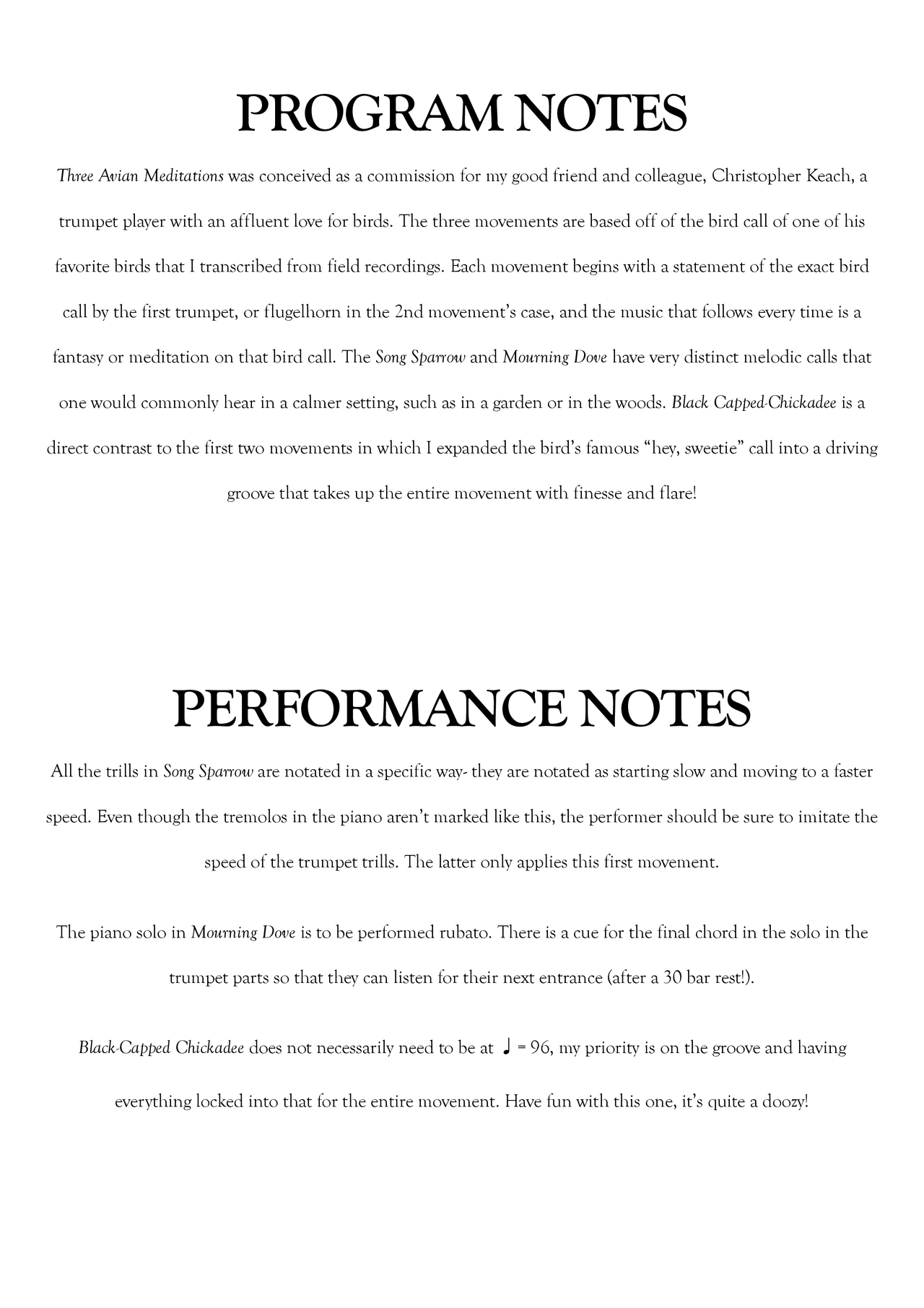 Three Avian Meditations was conceived as a commission for my good friend and colleague, Christopher Keach and his partner Margaret Hopkins, trumpet players with affluent loves for birds. The three movements are based off of the bird call of one of his favorite birds that I transcribed from field recordings. Each movement begins with a statement of the bird call by the first trumpet (or flugelhorn in the 2nd movement’s case) and the music that follows every time is a fantasy or meditation on that bird call. The Song Sparrow and Mourning Dove have very distinct melodic calls that one would commonly hear in a calmer setting, such as in a garden or in the woods. Black Capped-Chickadee is a direct contrast to the first two movements in which I expanded the bird’s famous “hey, sweetie” call into a driving groove that takes up the entire movement with finesse and flare!