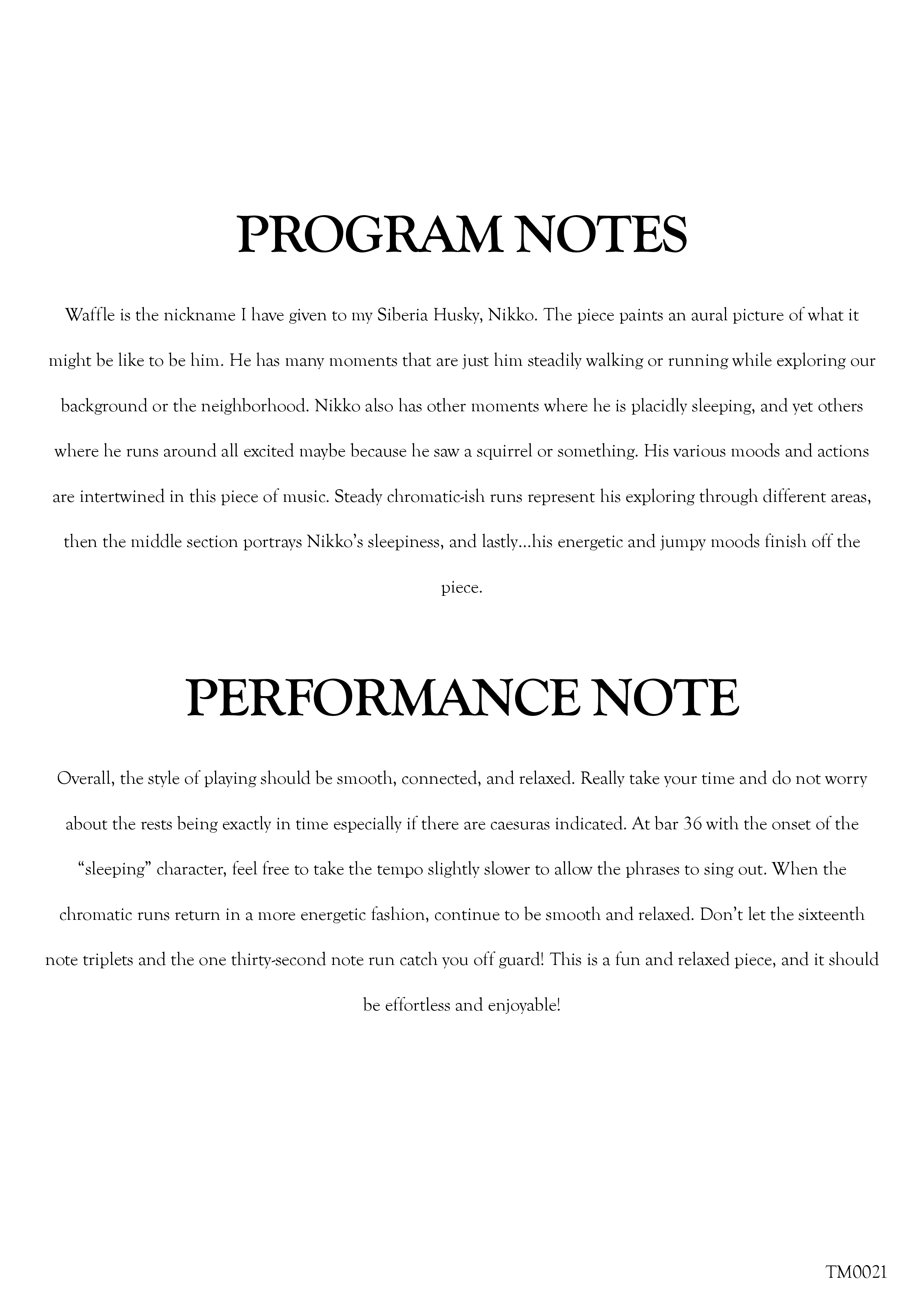 Waffle is the nickname I have given to my Siberia Husky, Nikko. The piece paints an aural picture of what it might be like to be him. He has many moments that are just him steadily walking or running while exploring our background or the neighborhood. Nikko also has other moments where he is placidly sleeping, and yet others where he runs around all excited maybe because he saw a squirrel or something. His various moods and actions are intertwined in this piece of music. Steady chromatic-ish runs represent his exploring through different areas, then the middle section portrays Nikko’s sleepiness, and lastly...his energetic and jumpy moods finish off the piece.