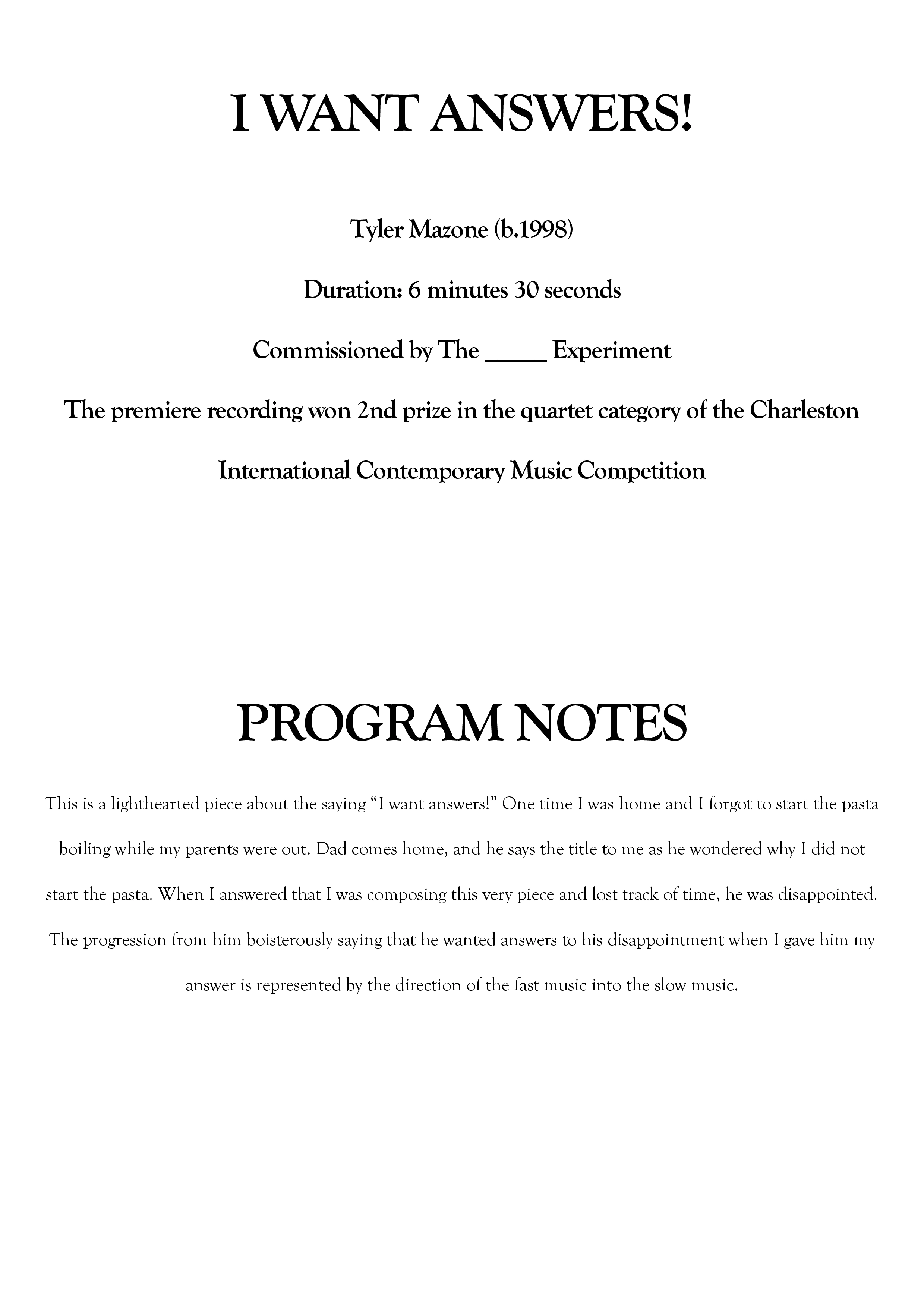 This is a lighthearted piece about the saying “I want answers!” One time I was home and I forgot to start the pasta boiling while my parents were out. Dad comes home, and he says the title to me as he wondered why I did not start the pasta. When I answered that I was composing this very piece and lost track of time, he was disappointed. The progression from him boisterously saying that he wanted answers to his disappointment when I gave him my answer is represented by the direction of the fast music into the slow music.